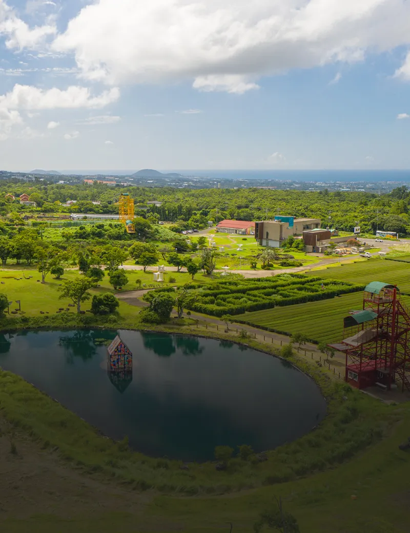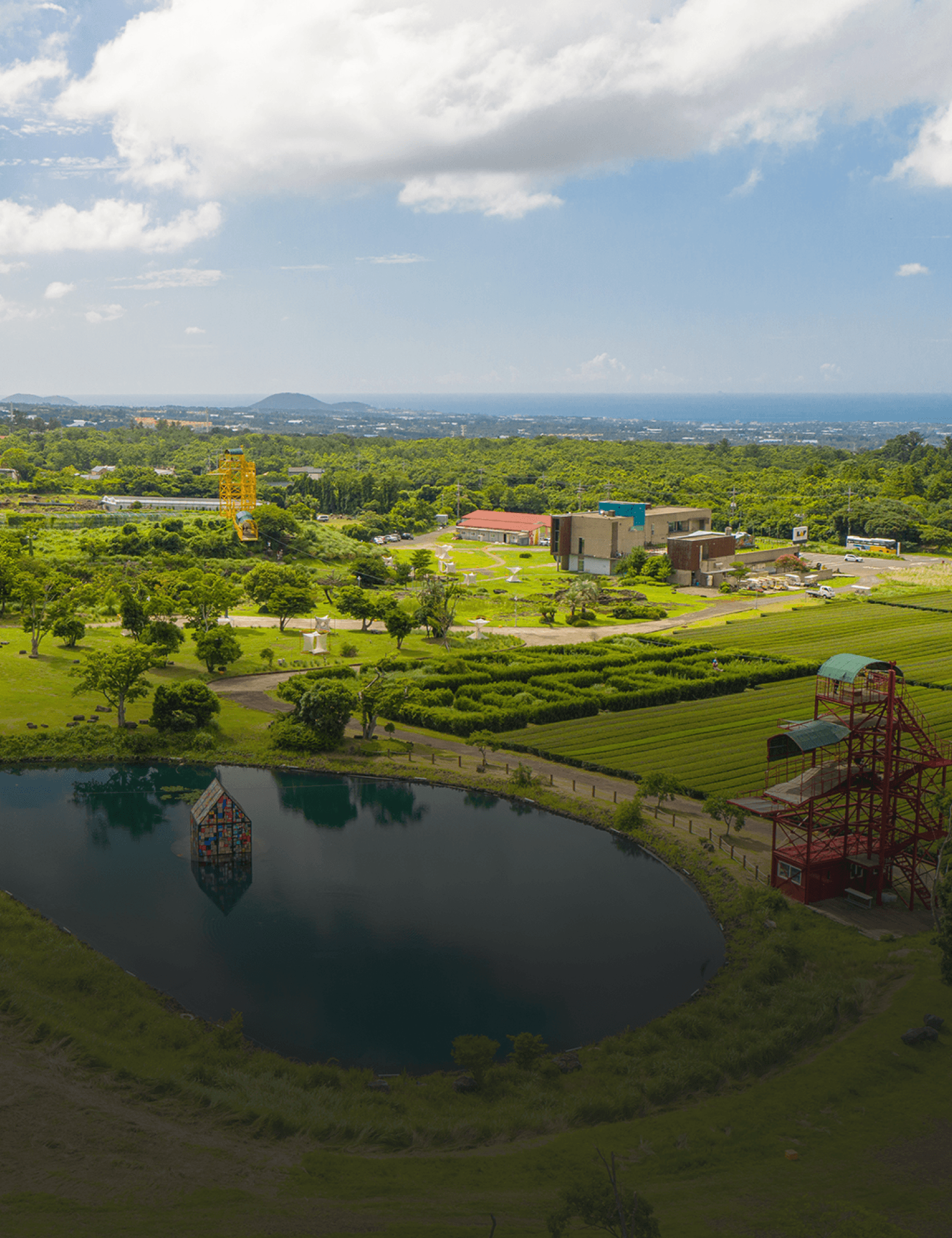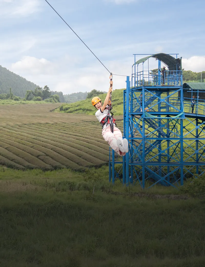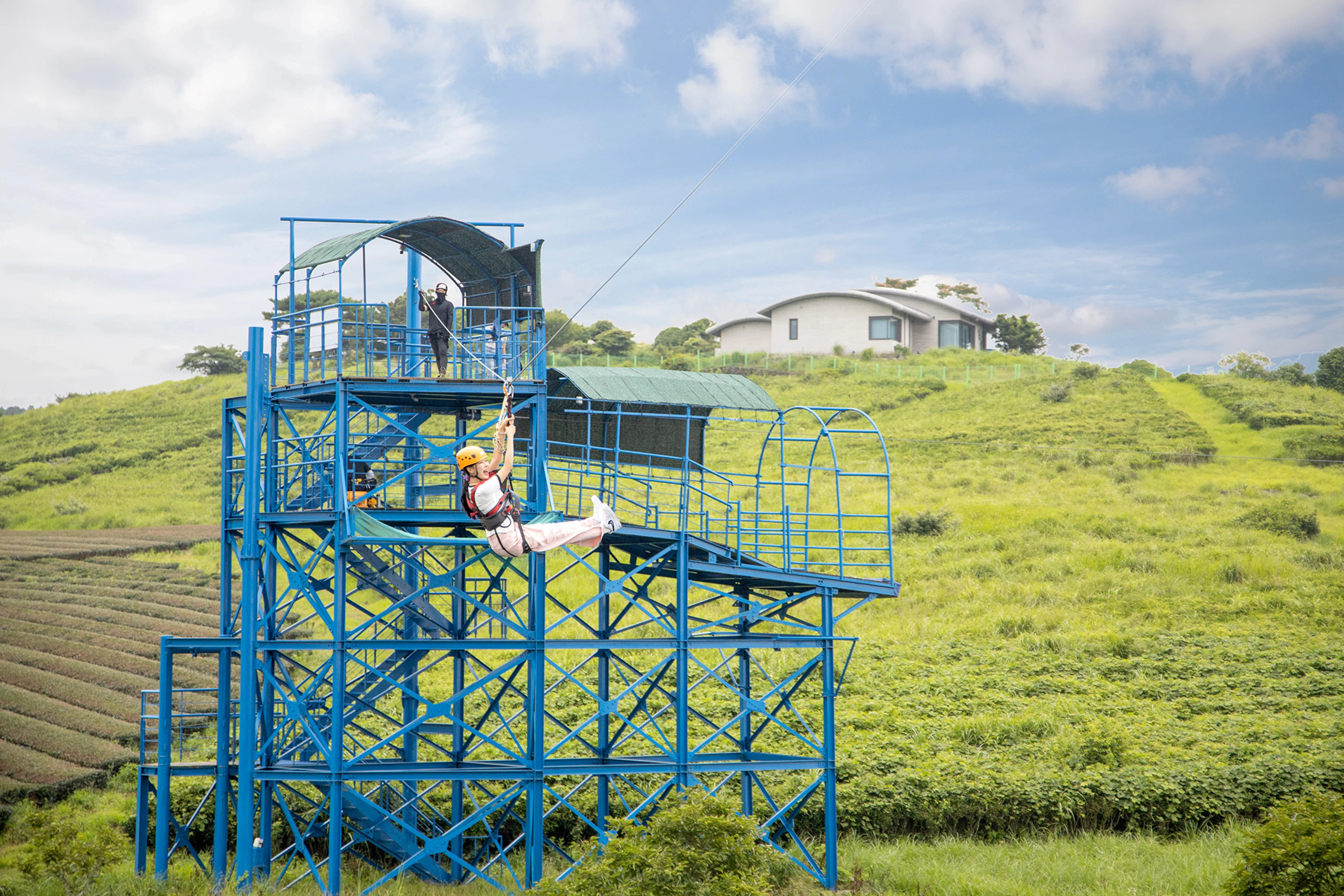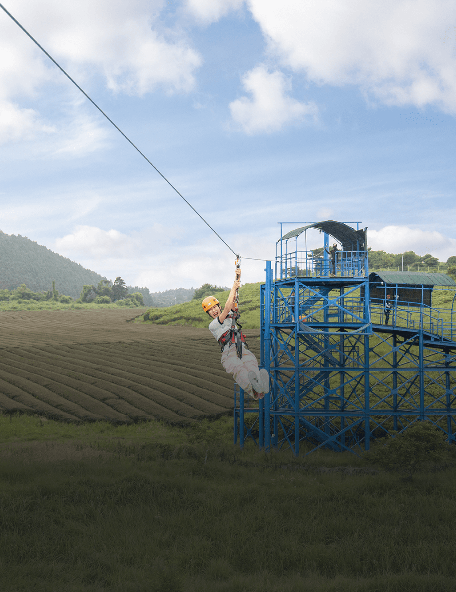 거문오름의 광활한 녹차밭을 가로지르는 와이어를 통해 제주의 아름다운 자연과 짜릿한 즐거움을 느낄 수 있습니다.